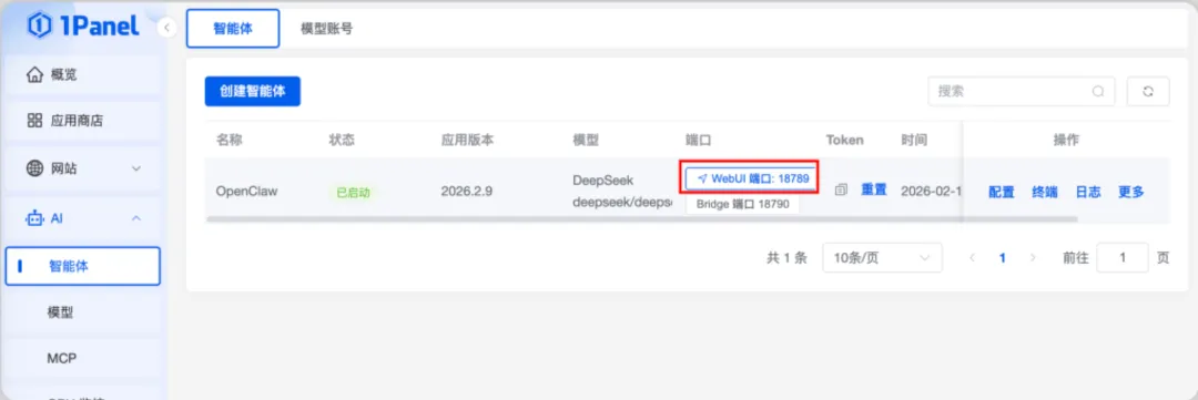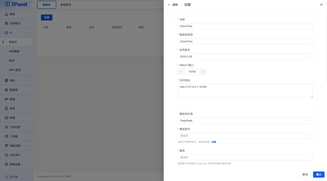 装好之后,通过 1Panel 的界面管理模型、查看运行状态、配置智能体。