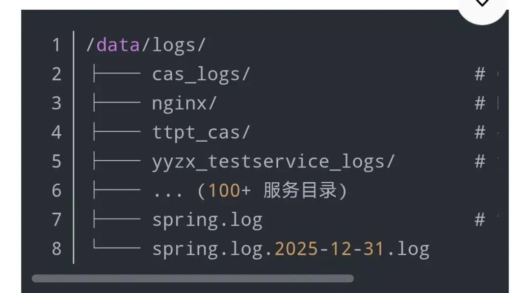 在生产环境中,随着服务持续运行,日志文件会不断累积,占用大量磁盘空间。以某开发测试服务器为例: