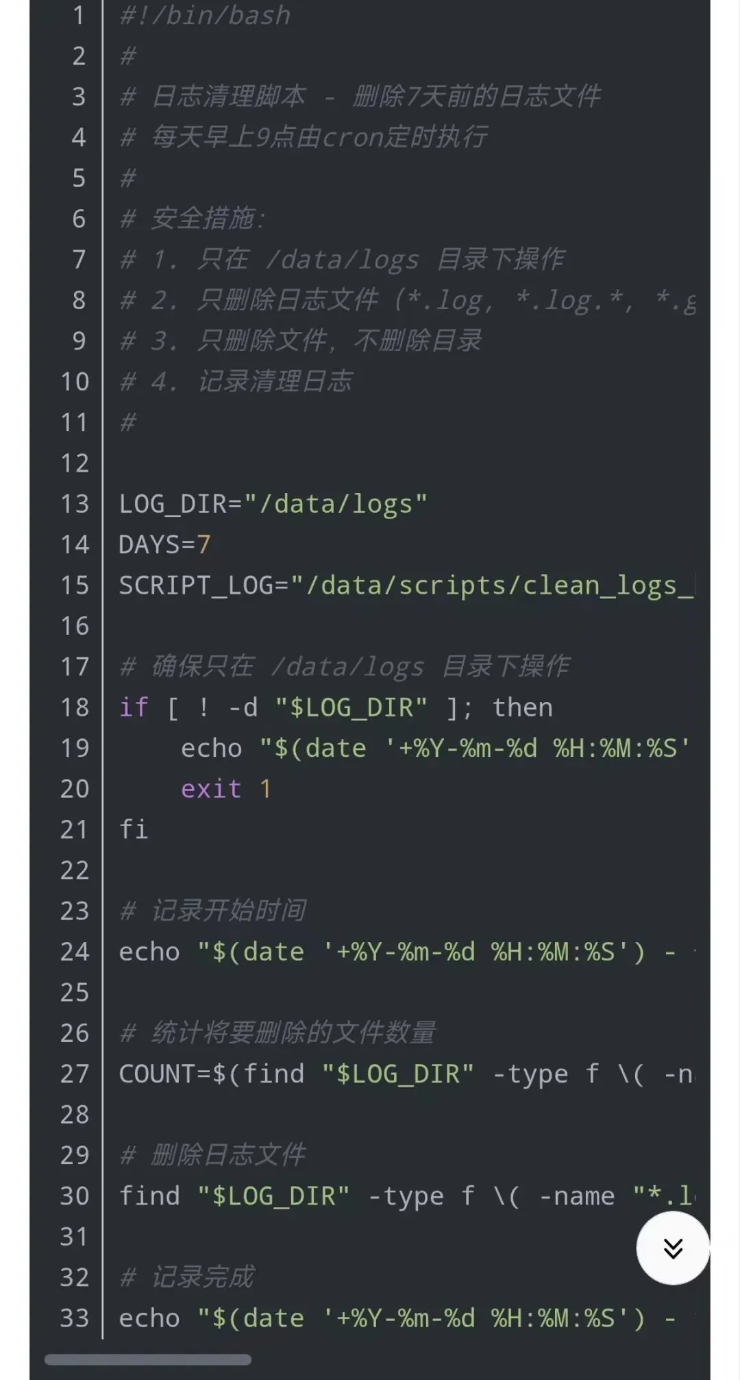 使用 find + cron 组合实现自动化日志清理: