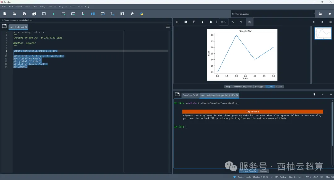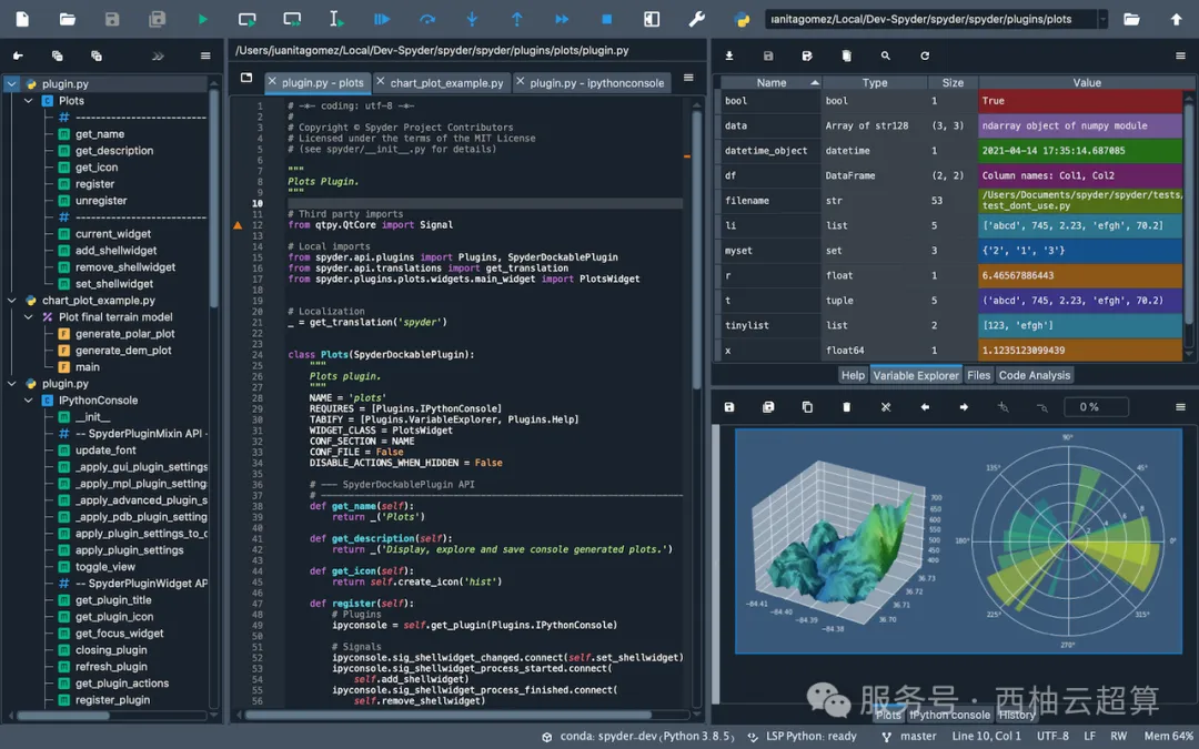 Spyder 是一款专为科学计算和数据分析设计的开源 Python 集成开发环境(IDE),尤其在学术研究、工程计算和数据科学领域广泛使用。它由 Python 科学计算生态的核心团队开发,与 NumPy、Pandas、Matplotlib 等库深度集成,提供了直观的界面和高效的工作流。