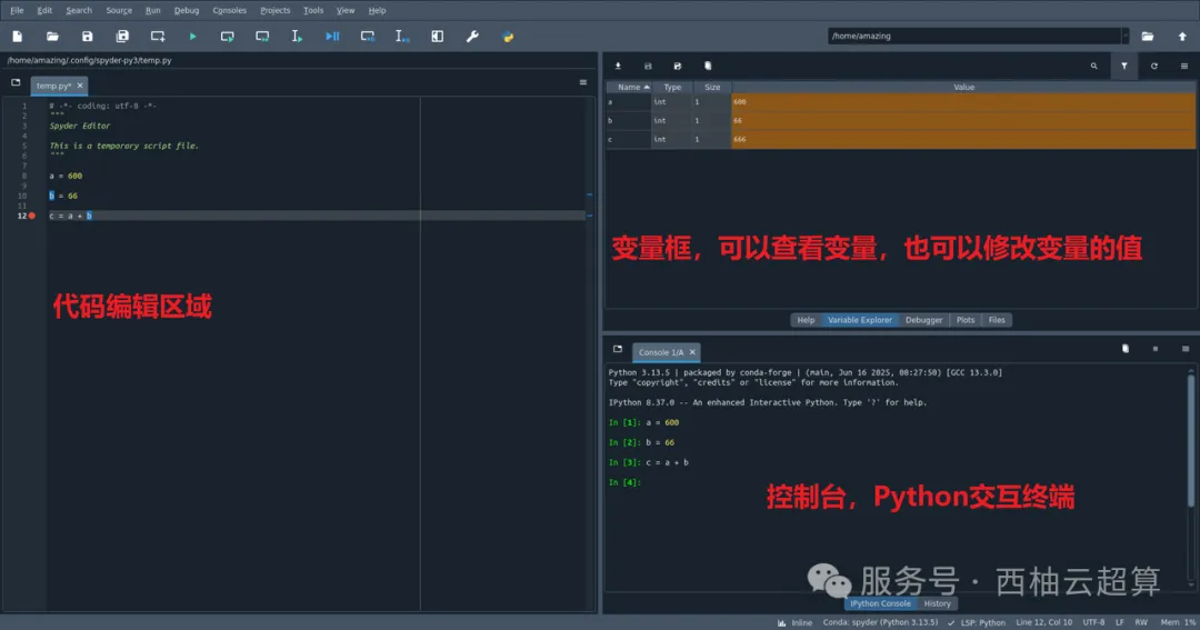 Spyder编写代码后运行,可以实时查看与修改变量,也可在Python交互终端实时执行代码。