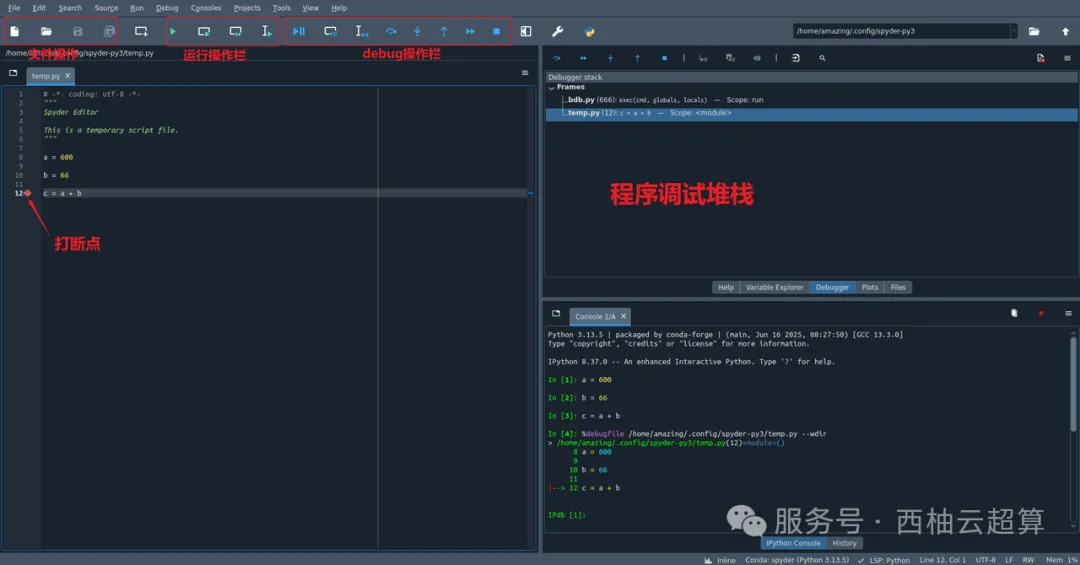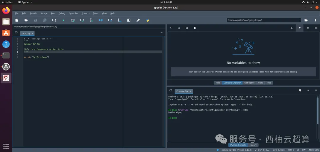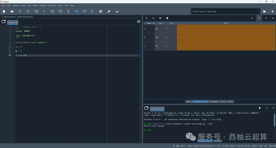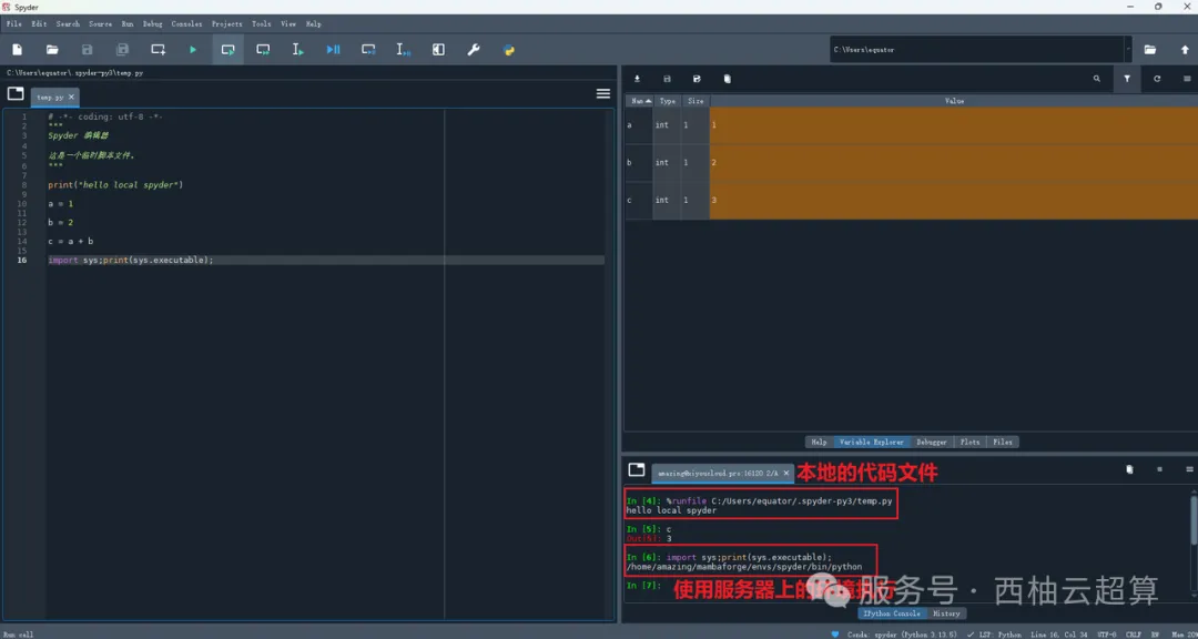 使用MobaXterm连接上服务器后,Linux命令行运行spyder命令,本地电脑就会弹出Spyder窗口,在这个窗口编辑的文件,环境均是服务器上的。