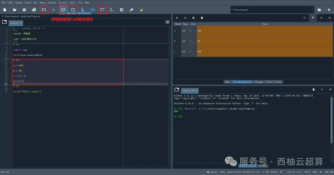 Spyder也支持Cell语法,可以分块运行代码。和Matlab、Jupyter中的Cell功能类似的,只不过Spyder中的Cell是通过# %%注释来实现的,通过Cell我们就可以单独运行和调试代码片段了。