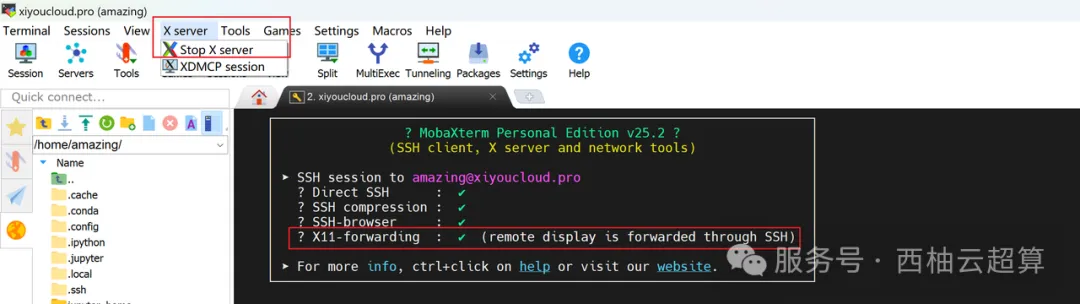 如果上一步正确开启了X11Forwarding,那么在MobaXterm连接上去的时候,其会提示remote display is forwarded through SSH。