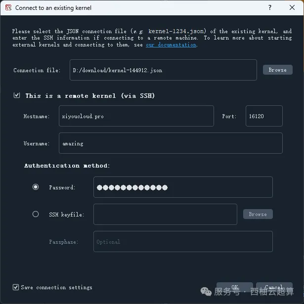 Connection file选择上一步下载下来的文件,按连接SSH的方式填充remote kernel的信息。