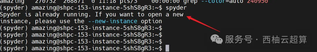 如果在X11转发运行Spyder的过程中,SSH连接断开了,再次启动会提示Spyder is already running. If you want to open a new instance, please use the --new-instance option。如果我们一直使用--new-instance参数,会导致启动多个Spyder进程,所以最好不要这样做。