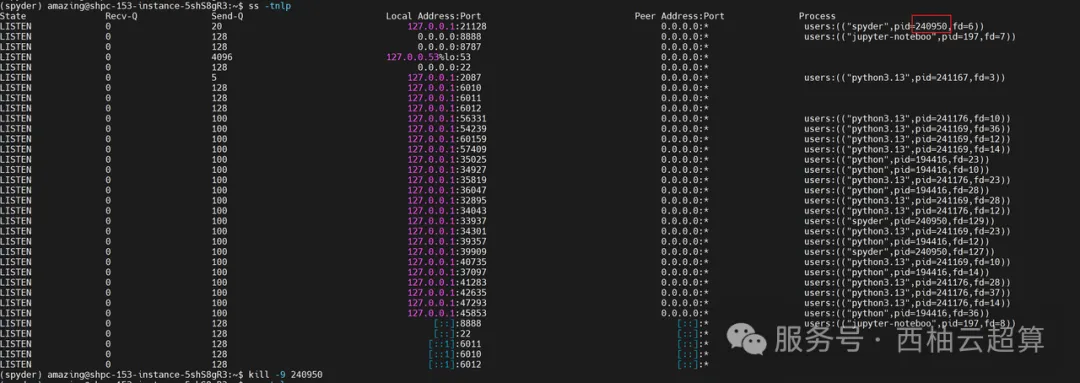 # 通过监听端口找到Spyder的进程号ss -tnlp# 杀死Spyder进程kill -9 Spyder的进程号# 启动Spyderspyder