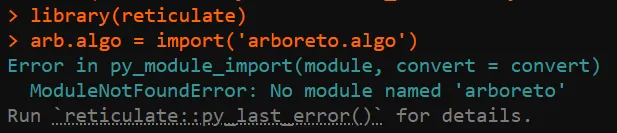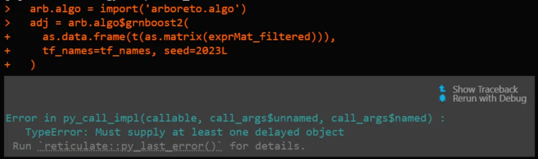 # 基因共表达网络计算mymethod <-'grnboost2'# 'grnboost2'library(reticulate)if(mymethod=='runGenie3'){runGenie3(exprMat_filtered_log, scenicOptions)}else{ arb.algo =import('arboreto.algo') tf_names =getDbTfs(scenicOptions) tf_names = Seurat::CaseMatch(search = tf_names,match =rownames(exprMat_filtered)) adj = arb.algo$grnboost2(as.data.frame(t(as.matrix(exprMat_filtered))),tf_names=tf_names, seed=2025L )colnames(adj) =c('TF','Target','weight')saveRDS(adj,file=getIntName(scenicOptions,'genie3ll'))}问题是,上面的这个R代码框经常会遇到arboreto加载失败,要么找不到: