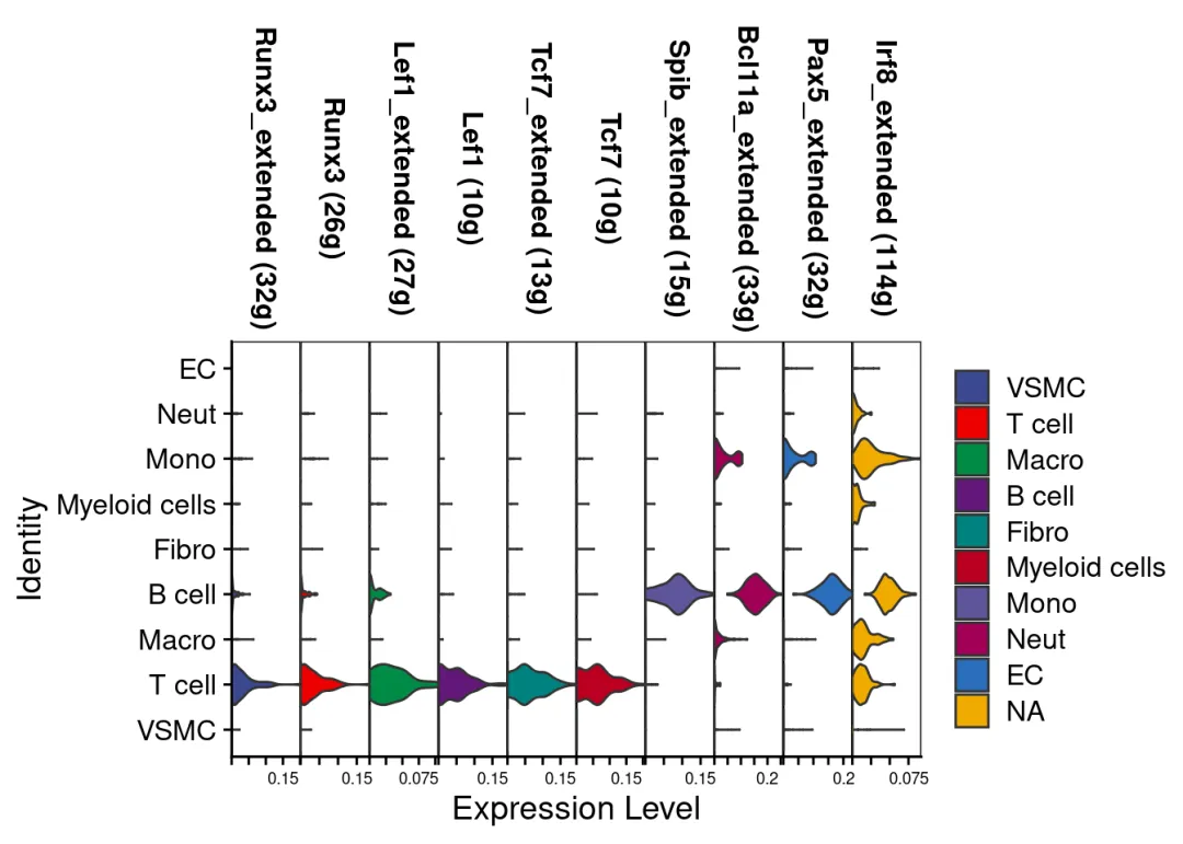 # 读取Python输出的GRN结果adj <-read.csv("data/grnboost2_results.csv")# 转换为数据框并设置列名(确保与之前的格式一致)adj <-as.data.frame(adj)colnames(adj) <-c('TF', 'Target', 'weight')# 保存为RDS文件,供后续分析使用saveRDS(adj, file =getIntName(scenicOptions, 'genie3ll'))# 验证结果cat("成功读取GRNBoost2结果,共", nrow(adj), "条调控关系\n")# 运行经典的SCENIC step1-4exprMat_log <-log2(exprMat+1)scenicOptions@settings$dbs <- scenicOptions@settings$dbs["10kb"] # Toy run settingsscenicOptions <-runSCENIC_1_coexNetwork2modules(scenicOptions)scenicOptions <-runSCENIC_2_createRegulons(scenicOptions, coexMethod=c("top5perTarget")) # Toy run settingsscenicOptions <-runSCENIC_3_scoreCells(scenicOptions, exprMat_log)scenicOptions <-runSCENIC_4_aucell_binarize(scenicOptions)#将AUCell矩阵二元化# 保存镜像save.image('data/biomamba_scenic.rdata')# 这时我们就拥有与纯在R语言中执行SCENIC一样的工程文件:tree ./int## [01;34m./int[00m## ├── 1.1_genesKept.Rds## ├── 1.2_corrMat.Rds## ├── 1.4_GENIE3_linkList.Rds## ├── 1.5_weightPlot.pdf## ├── 1.6_tfModules_asDF.Rds## ├── 2.1_tfModules_forMotifEnrichmet.Rds## ├── 2.2_motifs_AUC.Rds## ├── 2.3_motifEnrichment.Rds## ├── 2.4_motifEnrichment_selfMotifs_wGenes.Rds## ├── 2.5_regulonTargetsInfo.Rds## ├── 2.6_regulons_asGeneSet.Rds## ├── 2.6_regulons_asIncidMat.Rds## ├── 3.1_regulons_forAUCell.Rds## ├── 3.2_aucellGenesStats.pdf## ├── 3.3_aucellRankings.Rds## ├── 3.4_regulonAUC.Rds## ├── 3.5_AUCellThresholds_Info.tsv## ├── 3.5_AUCellThresholds.Rds## ├── 4.1_binaryRegulonActivity.Rds## ├── 4.2_binaryRegulonActivity_nonDupl.Rds## ├── 4.3_regulonSelections.Rds## ├── 4.4_binaryRegulonOrder.Rds## └── tSNE_AUC_50pcs_30perpl.Rds## ## 0 directories, 23 files# 读取AUCell Score矩阵:auc_score <-getAUC(readRDS("int/3.4_regulonAUC.Rds"))# 添加到注释信息中:scRNA <-AddMetaData(scRNA,metadata =t(auc_score))# 小提琴挑几个转录因子瞅瞅:VlnPlot(scRNA,rownames(auc_score)[1:10],stack = T,cols =c(ggsci::pal_aaas()(8),ggsci::pal_bmj()(8)) )