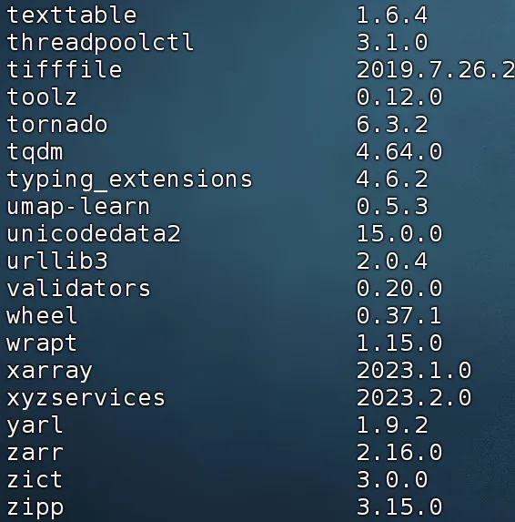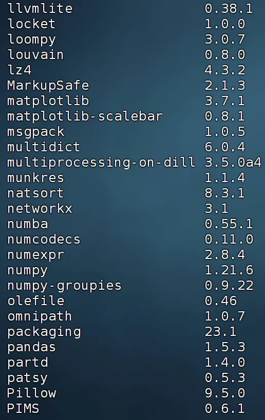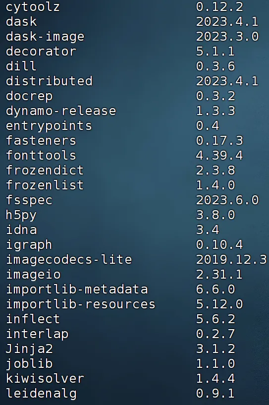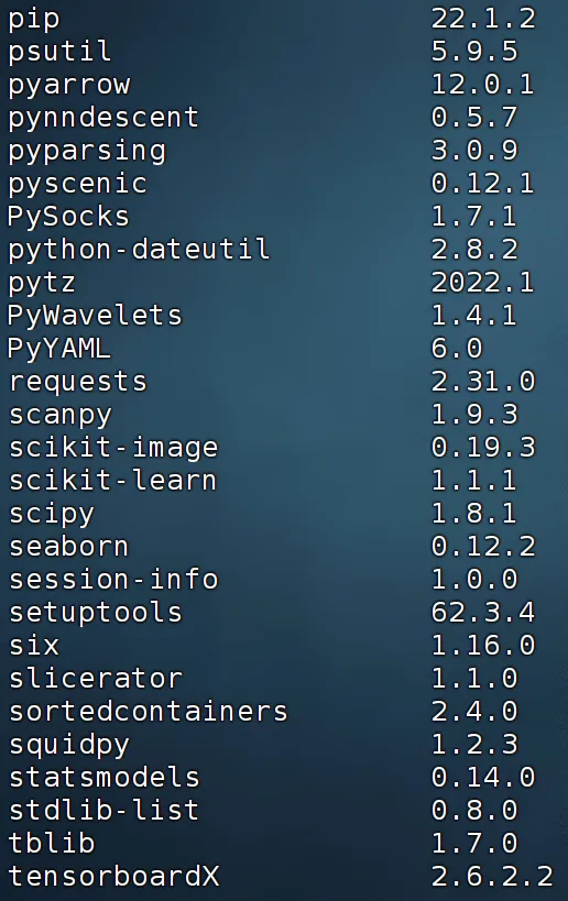 sessionInfo()## R version 4.4.2 (2024-10-31)## Platform: x86_64-pc-linux-gnu## Running under: Ubuntu 20.04.4 LTS## ## Matrix products: default## BLAS: /usr/lib/x86_64-linux-gnu/openblas-pthread/libblas.so.3 ## LAPACK: /usr/lib/x86_64-linux-gnu/openblas-pthread/liblapack.so.3; LAPACK version 3.9.0## ## locale:## [1] LC_CTYPE=en_US.UTF-8 LC_NUMERIC=C ## [3] LC_TIME=en_US.UTF-8 LC_COLLATE=en_US.UTF-8 ## [5] LC_MONETARY=en_US.UTF-8 LC_MESSAGES=en_US.UTF-8 ## [7] LC_PAPER=en_US.UTF-8 LC_NAME=C ## [9] LC_ADDRESS=C LC_TELEPHONE=C ## [11] LC_MEASUREMENT=en_US.UTF-8 LC_IDENTIFICATION=C ## ## time zone: Etc/UTC## tzcode source: system (glibc)## ## attached base packages:## [1] stats graphics grDevices utils datasets methods base ## ## other attached packages:## [1] Seurat_5.2.1 SeuratObject_5.0.2 sp_2.2-0 AUCell_1.28.0 ## [5] RcisTarget_1.26.0 SCopeLoomR_0.13.0 SCENIC_1.3.1 ## ## loaded via a namespace (and not attached):## [1] RcppAnnoy_0.0.22 splines_4.4.2 ## [3] later_1.4.1 bitops_1.0-9 ## [5] tibble_3.2.1 R.oo_1.27.0 ## [7] polyclip_1.10-7 graph_1.84.1 ## [9] XML_3.99-0.18 fastDummies_1.7.5 ## [11] lifecycle_1.0.4 globals_0.16.3 ## [13] lattice_0.22-6 hdf5r_1.3.12 ## [15] MASS_7.3-64 magrittr_2.0.3 ## [17] plotly_4.10.4 sass_0.4.9 ## [19] rmarkdown_2.29 jquerylib_0.1.4 ## [21] yaml_2.3.10 remotes_2.5.0 ## [23] httpuv_1.6.15 sctransform_0.4.1 ## [25] spam_2.11-1 spatstat.sparse_3.1-0 ## [27] sessioninfo_1.2.2 pkgbuild_1.4.6 ## [29] reticulate_1.43.0.9001 cowplot_1.1.3 ## [31] pbapply_1.7-2 DBI_1.2.3 ## [33] RColorBrewer_1.1-3 abind_1.4-8 ## [35] pkgload_1.4.0 zlibbioc_1.52.0 ## [37] Rtsne_0.17 GenomicRanges_1.58.0 ## [39] purrr_1.0.2 R.utils_2.12.3 ## [41] BiocGenerics_0.52.0 RCurl_1.98-1.16 ## [43] GenomeInfoDbData_1.2.13 IRanges_2.40.1 ## [45] S4Vectors_0.44.0 ggrepel_0.9.6 ## [47] irlba_2.3.5.1 spatstat.utils_3.1-4 ## [49] listenv_0.9.1 openintro_2.5.0 ## [51] goftest_1.2-3 airports_0.1.0 ## [53] RSpectra_0.16-2 spatstat.random_3.4-1 ## [55] annotate_1.84.0 fitdistrplus_1.2-2 ## [57] parallelly_1.42.0 DelayedMatrixStats_1.28.1 ## [59] codetools_0.2-20 DelayedArray_0.32.0 ## [61] tidyselect_1.2.1 UCSC.utils_1.2.0 ## [63] farver_2.1.2 spatstat.explore_3.4-3 ## [65] matrixStats_1.5.0 stats4_4.4.2 ## [67] jsonlite_1.8.9 ellipsis_0.3.2 ## [69] progressr_0.15.1 ggridges_0.5.6 ## [71] survival_3.8-3 tools_4.4.2 ## [73] ica_1.0-3 Rcpp_1.0.14 ## [75] glue_1.8.0 gridExtra_2.3 ## [77] SparseArray_1.6.0 xfun_0.50 ## [79] MatrixGenerics_1.18.1 usethis_3.1.0 ## [81] GenomeInfoDb_1.42.1 dplyr_1.1.4 ## [83] withr_3.0.2 BiocManager_1.30.25 ## [85] fastmap_1.2.0 digest_0.6.37 ## [87] R6_2.5.1 mime_0.12 ## [89] colorspace_2.1-1 scattermore_1.2 ## [91] tensor_1.5 spatstat.data_3.1-6 ## [93] RSQLite_2.3.9 R.methodsS3_1.8.2 ## [95] ggsci_3.2.0 tidyr_1.3.1 ## [97] generics_0.1.3 data.table_1.16.4 ## [99] usdata_0.3.1 httr_1.4.7 ## [101] htmlwidgets_1.6.4 S4Arrays_1.6.0 ## [103] uwot_0.2.2 pkgconfig_2.0.3 ## [105] gtable_0.3.6 blob_1.2.4 ## [107] lmtest_0.9-40 XVector_0.46.0 ## [109] htmltools_0.5.8.1 profvis_0.4.0 ## [111] dotCall64_1.2 GSEABase_1.64.0 ## [113] scales_1.3.0 Biobase_2.66.0 ## [115] png_0.1-8 spatstat.univar_3.1-3 ## [117] knitr_1.49 rstudioapi_0.17.1 ## [119] reshape2_1.4.4 tzdb_0.4.0 ## [121] nlme_3.1-168 cachem_1.1.0 ## [123] zoo_1.8-12 stringr_1.5.1 ## [125] KernSmooth_2.23-26 parallel_4.4.2 ## [127] miniUI_0.1.1.1 arrow_18.1.0.1 ## [129] AnnotationDbi_1.68.0 pillar_1.10.1 ## [131] grid_4.4.2 vctrs_0.6.5 ## [133] RANN_2.6.2 urlchecker_1.0.1 ## [135] promises_1.3.2 xtable_1.8-4 ## [137] cluster_2.1.8 evaluate_1.0.3 ## [139] readr_2.1.5 cli_3.6.3 ## [141] compiler_4.4.2 rlang_1.1.5 ## [143] crayon_1.5.3 future.apply_1.11.3 ## [145] labeling_0.4.3 plyr_1.8.9 ## [147] fs_1.6.5 stringi_1.8.4 ## [149] deldir_2.0-4 viridisLite_0.4.2 ## [151] assertthat_0.2.1 munsell_0.5.1 ## [153] Biostrings_2.74.1 lazyeval_0.2.2 ## [155] spatstat.geom_3.4-1 devtools_2.4.5 ## [157] Matrix_1.7-2 RcppHNSW_0.6.0 ## [159] hms_1.1.3 patchwork_1.3.0 ## [161] sparseMatrixStats_1.18.0 bit64_4.6.0-1 ## [163] future_1.34.0 ggplot2_3.5.1 ## [165] KEGGREST_1.46.0 shiny_1.10.0 ## [167] SummarizedExperiment_1.36.0 ROCR_1.0-11 ## [169] igraph_2.1.4 memoise_2.0.1 ## [171] bslib_0.9.0 bit_4.5.0.1 ## [173] cherryblossom_0.1.0