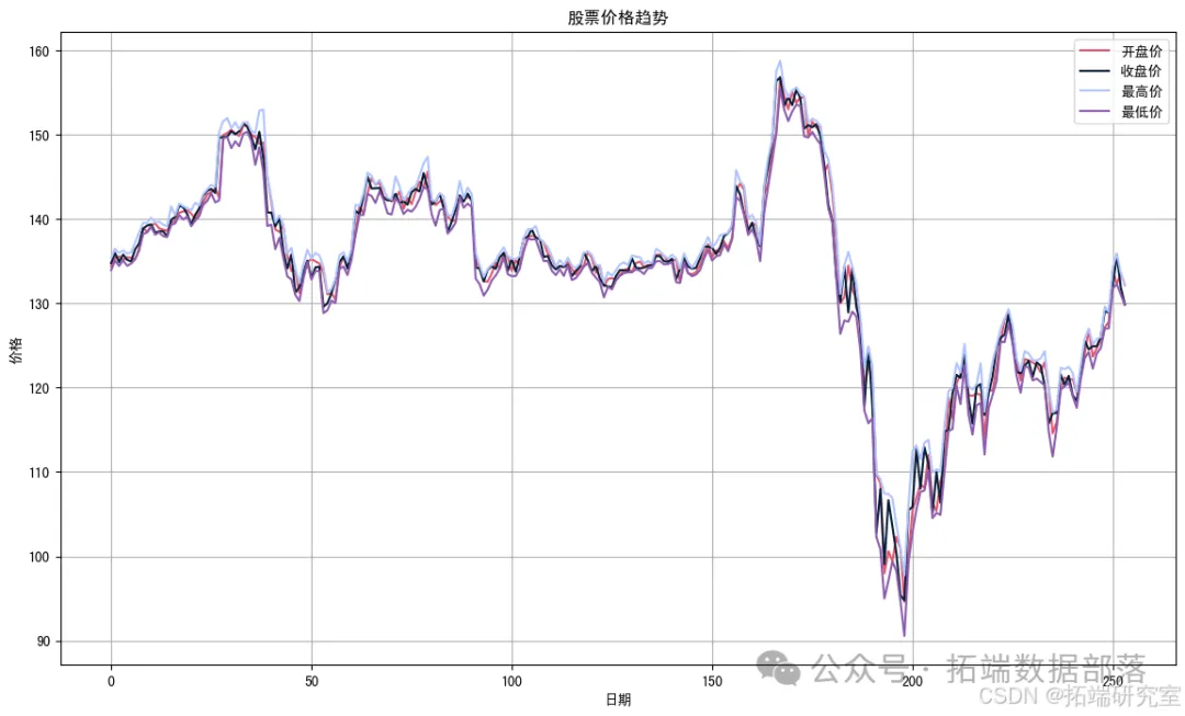 股票的开盘价、收盘价、最高价和最低价的趋势图。