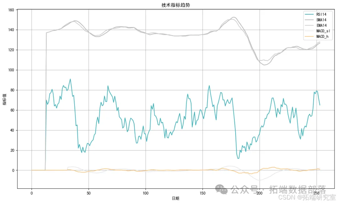 第三个图表展示了技术指标(RSI14、SMA14、EMA14、MACD_sl、MACD_h)的趋势。