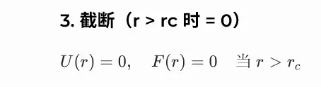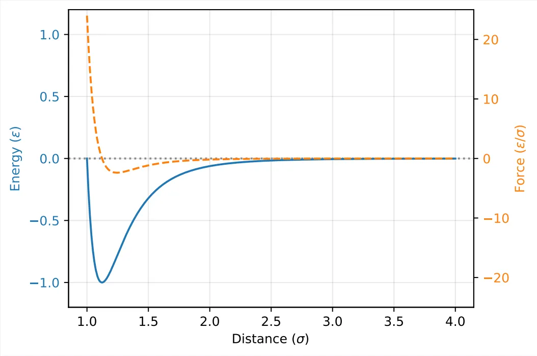 import matplotlib.pyplot as pltimport numpy as npdef lj_potential(r: np.ndarray, cutoff: float) -> np.ndarray:"""计算 Lennard-Jones 势能参数:r: 距离数组cutoff: 截断半径返回:势能数组"""# 避免除零错误r = np.maximum(r, 1e-8)potential = 4 * (1 / r**12 - 1 / r**6)potential[r > cutoff] = 0.0return potentialdef lj_force(r: np.ndarray, cutoff: float) -> np.ndarray:"""计算 Lennard-Jones 作用力 F = -dU/dr"""r = np.maximum(r, 1e-8)force = -4 * (-12 / r**13 + 6 / r**7)force[r > cutoff] = 0.0return force# ===================== 可配置参数 =====================CUTOFF_RADIUS = 4.0R_MIN, R_MAX = 1.0, 4.0NUM_POINTS = 500# ======================================================# 生成距离数组r_array = np.linspace(R_MIN, R_MAX, NUM_POINTS)# 计算势能与力u_vals = lj_potential(r_array, CUTOFF_RADIUS)f_vals = lj_force(r_array, CUTOFF_RADIUS)# 创建画布与轴fig, ax_energy = plt.subplots(figsize=(6, 4))# --------------------- 绘制势能(左轴)---------------------color_energy = "tab:blue"ax_energy.plot(r_array, u_vals, color=color_energy, label="Potential")ax_energy.axhline(0, ls=":", c="k", alpha=0.5, zorder=-1)ax_energy.set_xlabel(r"Distance ($\sigma$)")ax_energy.set_ylabel(r"Energy ($\epsilon$)", color=color_energy)ax_energy.tick_params(axis="y", labelcolor=color_energy)ax_energy.set_ylim(-1.2, 1.2)ax_energy.grid(True, alpha=0.3)# --------------------- 绘制力(右轴)---------------------ax_force = ax_energy.twinx()color_force = "tab:orange"ax_force.plot(r_array, f_vals, "--", color=color_force, label="Force")ax_force.set_ylabel(r"Force ($\epsilon/\sigma$)", color=color_force)ax_force.tick_params(axis="y", labelcolor=color_force)ax_force.set_ylim(-25, 25)# 自动调整布局plt.tight_layout()# 保存图片plt.savefig("fig-lj.pdf", dpi=300, bbox_inches="tight")plt.close()