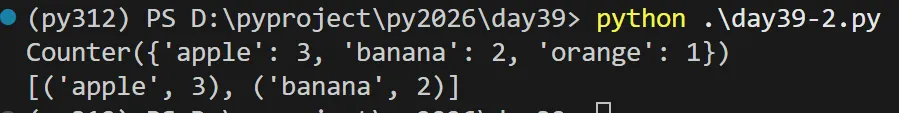 from collections import Counter# 统计列表中元素出现的次数words = ['apple', 'banana', 'apple', 'orange', 'banana', 'apple']count = Counter(words)print(count) # 输出: Counter({'apple': 3, 'banana': 2, 'orange': 1})# 获取出现次数最多的前2个元素print(count.most_common(2)) # 输出: [('apple', 3), ('banana', 2)]