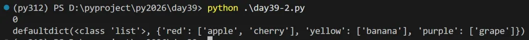 from collections import defaultdict# 默认值为 int(),即 0dd = defaultdict(int)dd['a'] = 1# 访问不存在的键 'b',不会报错,而是自动创建并赋值为 0print(dd['b']) # 输出: 0# 场景:按颜色分组水果fruits = [('apple', 'red'), ('banana', 'yellow'), ('grape', 'purple'), ('cherry', 'red')]groups = defaultdict(list)for fruit, color in fruits: groups[color].append(fruit)print(groups)