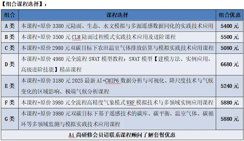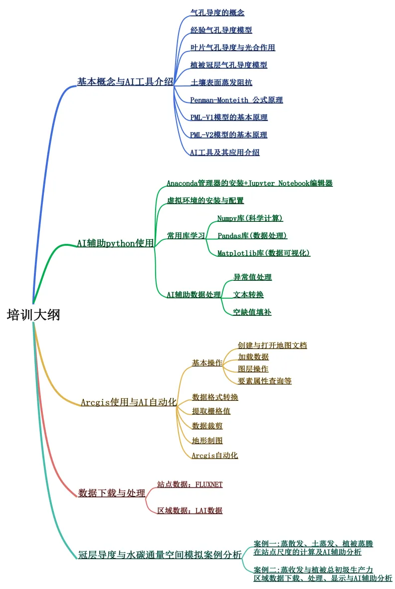 了解蒸散发ET及其组分(植被蒸腾Ec、土壤蒸发Es、冠层截留Ei)、植被总初级生产力GPP的概念和碳水耦合的基本原理;掌握利用Python与ArcGIS工具进行课程相关的操作;熟练掌握国际上流行的Penman-Monteith模型,并能够应用该模型在各种植被类型上进行冠层导度、蒸散发组分的计算;掌握单站和区域结果的可视化方法、制图方法等;学习运用AI工具(如DeepSeek、豆包,kimi等)辅助代码编写和数据处理。