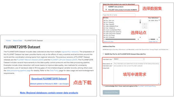 打开网址https://fluxnet.org/data/fluxnet2015-dataset/,点击Download FLUXNET2015 Dataset,进行用户名和账号密码登录后,可以根据需求选择站点,填写申请需求即可完成下载。