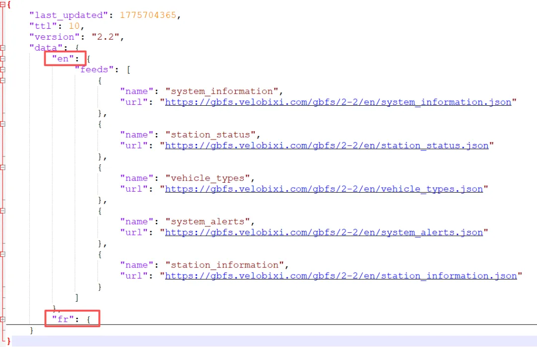 这个JSON文件按语言("en" 英语 / "fr" 法语)组织了数据源,我们看"en" 英语部分,主要是提供了5类数据的获取地址