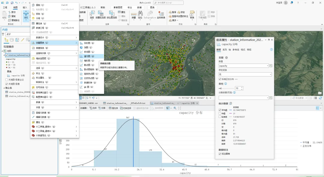 容量分布直方图:右键点图层 → 创建图表 → 直方图