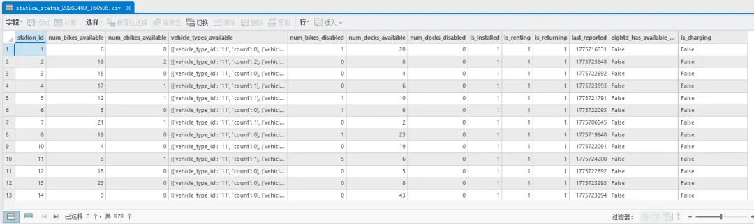 # 获取站点实时状态try: status_resp = requests.get(station_status_url) status_resp.raise_for_status()# 提取数据stations_status = status_resp.json()['data']['stations'] print(f"✅ 成功获取站点实时状态: 共 {len(stations_status)} 个站点有状态更新")# 转换为 DataFrame 并保存为 CSVtimestamp = datetime.now().strftime("%Y%m%d_%H%M%S") csv_filename = f"station_status_{timestamp}.csv"df_status = pd.DataFrame(stations_status) df_status.to_csv(csv_filename, index=False, encoding='utf-8-sig') print(f"💾 站点状态已保存到 CSV: {csv_filename}") except Exception as b: print(f"❌ 获取站点实时状态失败: {e}")return