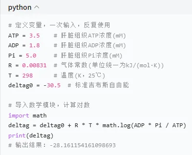 如果用普通计算器,算肝脏、肌肉、脑三个组织的 ΔG,要手动输入 3 次公式、换 6 次浓度,稍不注意就会输错数;但用 Python,只需要几行代码就能搞定: