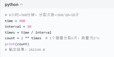 大肠杆菌 20 分钟分裂一次,6 小时后的数量,用 Python 一行代码搞定: