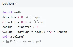 假设大肠杆菌是圆柱形,长度 2.0μm,直径 0.5μm,体积公式 V=πr²h:
