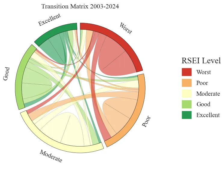 # 0. 导入库import matplotlib.pyplot as plt # Matplotlib 主绘图库(用于绘图、标题、图例等)import matplotlib.font_manager as fm # 字体管理模块(用于检测系统字体)import matplotlib.patches as mpatches # 用于构建图例中的色块(Patch对象)import seaborn as sns # Seaborn(用于统一图像风格)import numpy as np # 数值计算库(处理矩阵数据)import pandas as pd # 数据结构库(DataFrame用于存储矩阵)from pycirclize import Circos # 核心库:用于绘制弦图(Chord Diagram)# 1. 全局配置(所有参数集中管理)CHORD_CONFIG = {# 1.1 图像输出设置"dpi": 300, # 图像分辨率(论文一般要求300dpi)"formats": ["png"], # 输出格式(可扩展为pdf、tiff)"figsize": (10, 10), # 图像尺寸(正方形保证弦图为圆形)# 1.2 字体设置"font_family_en": "Times New Roman", # 英文字体(论文常用)"font_family_zh": "SimSun", # 中文字体(宋体)"sector_label_size": 15, # 扇区标签字体大小"title_fontsize": 16, # 标题字体大小"legend_fontsize": 10, # 图例字体大小# 1.3 弦图结构参数"sector_space": 3, # 扇区之间的间隔(单位:度)"inner_radius": 90, # 外环内半径(0-100)"outer_radius": 100, # 外环外半径(0-100)"label_radius_pos": 110, # 标签显示半径(需大于outer_radius)# 1.4 弦(连线)样式"link_alpha": 0.6, # 弦透明度(越小越透明)"link_edge_width": 0.2, # 弦边框宽度"link_edge_color": "#333333", # 弦边框颜色(深灰)# 1.5 分类颜色(根据数据类别进行添加颜色)"category_colors": {"Worst": "#d73027", # 最差(红色)"Poor": "#fdae61", # 较差(橙色)"Moderate": "#ffffbf", # 中等(浅黄)"Good": "#a6d96a", # 较好(浅绿)"Excellent": "#1a9850", # 最优(深绿)},# 1.6 图例配置"legend": {"title": "RSEI Level", # 图例标题"loc": "center left", # 图例位置(左中)"bbox_to_anchor": (1.2, 0.5), # 图例锚点(控制偏移)"frameon": False, # 是否显示图例边框"fontsize": 15, # 图例字体大小"title_fontsize": 20, # 图例标题字体大小'handlelength': 1.5, # 图例长度'handleheight': 1.5 # 图例高度},# 1.7 图标题"title": "Transition Matrix 2003-2024"}#-------------------------------------------------------------------------------# 2. 字体环境配置# 获取系统中所有已安装字体名称available_fonts = [f.name for f in fm.fontManager.ttflist]# 从配置中读取目标字体en_font = CHORD_CONFIG["font_family_en"]zh_font = CHORD_CONFIG["font_family_zh"]if en_font not in available_fonts:print(f"Warning: '{en_font}' not found, fallback enabled.")if zh_font not in available_fonts:print(f"Warning: '{zh_font}' not found, Chinese may not display.")# 设置字体回退机制font_fallback = [en_font, zh_font, "Arial", "sans-serif"]# 配置 Matplotlib 全局参数plt.rcParams.update({"font.family": "sans-serif", # 字体类型"font.sans-serif": font_fallback, # 字体候选列表"axes.unicode_minus": False, # 正常显示负号"savefig.dpi": CHORD_CONFIG["dpi"], # 保存分辨率"figure.titlesize": CHORD_CONFIG["title_fontsize"]})# 设置 Seaborn 风格(白底)sns.set_theme(style="white", rc={"font.sans-serif": font_fallback,"axes.unicode_minus": False})print("Environment initialized.") # 提示初始化完成############################# 主程序 ################################### 1. 转移矩阵读取 (这里我们随机生成)data = np.array([[30, 10, 5, 2, 1],[8, 25, 10, 3, 2],[5, 10, 30, 8, 3],[2, 4, 8, 20, 6],[1, 2, 3, 5, 15]])# 2. 类别名categories = ["Worst", "Poor", "Moderate", "Good", "Excellent"]# 3. 将 Numpy 的 array 转换为 DataFramedf = pd.DataFrame(data, index=categories, columns=categories)# 4. 构建颜色映射(保证顺序一致)# 按类别顺序提取颜色(避免字典乱序问题)cmap = CHORD_CONFIG["category_colors"]# 6. 绘制弦图circos = Circos.initialize_from_matrix(df, # 转移矩阵space=CHORD_CONFIG["sector_space"], # 扇区间隔r_lim=(CHORD_CONFIG["inner_radius"], CHORD_CONFIG["outer_radius"]), # 半径范围cmap=cmap, # 分类颜色label_kws=dict(size=CHORD_CONFIG["sector_label_size"], # 标签字体大小r=CHORD_CONFIG["label_radius_pos"] # 标签位置),link_kws=dict(alpha=CHORD_CONFIG["link_alpha"], # 弦透明度lw=CHORD_CONFIG["link_edge_width"], # 边框宽度ec=CHORD_CONFIG["link_edge_color"] # 边框颜色) )fig = circos.plotfig()# 7. 构建图例对象与添加图例legend_handles = [mpatches.Patch(color=CHORD_CONFIG["category_colors"][c], # 颜色label=c # 标签)for c in categories]legend_cfg = CHORD_CONFIG["legend"]plt.legend(handles=legend_handles, # 图例元素title=legend_cfg["title"], # 图例标题loc=legend_cfg["loc"], # 图例位置bbox_to_anchor=legend_cfg["bbox_to_anchor"], # 偏移位置frameon=legend_cfg["frameon"], # 是否显示边框fontsize=legend_cfg["fontsize"], # 字体大小title_fontsize=legend_cfg["title_fontsize"], # 标题字体大小handlelength=legend_cfg['handlelength'], # 图例块长度handleheight=legend_cfg['handleheight'] # 图例块高度)# 8. 添加标题plt.title(CHORD_CONFIG["title"], # 标题文本fontsize=CHORD_CONFIG["title_fontsize"], # 字体大小fontfamily=CHORD_CONFIG["font_family_en"] # 字体)# 9. 显示图像plt.show()