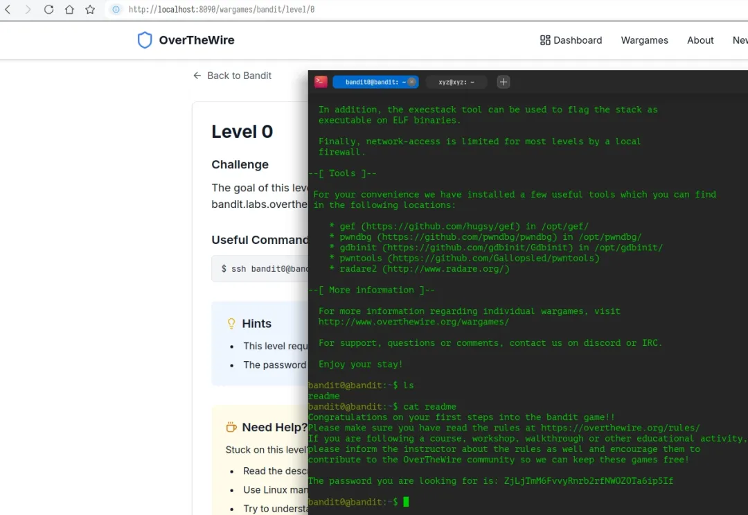 sudo apt install docker-ce docker-ce-cli containerd.io docker.io# 安装 dockerdocker pull tynybite/overthewire:latest# 拉取 overthewire 镜像docker run -it --rm tynybite/overthewire /bin/sh# 查看镜像内容docker run -p 8090:80 tynybite/overthewire# 运行镜像到容器,本地访问localhost:8090