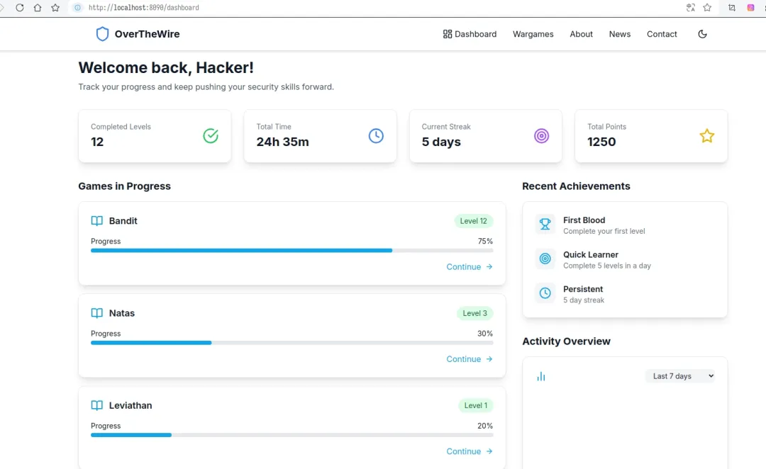 考虑到本地部署OvertheWire更方便查看练习进度,采取docker镜像运行的方式,直接提供本地化部署。