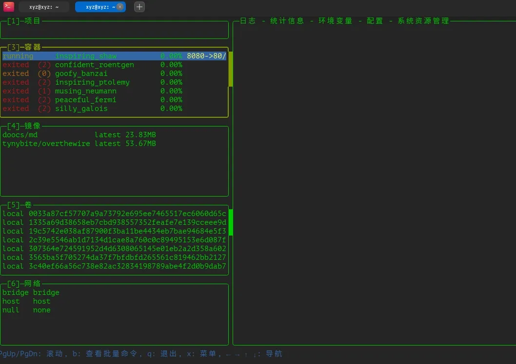 推荐安装 lazydocker 工具,TUI界面方便管理镜像和容器运行情况。