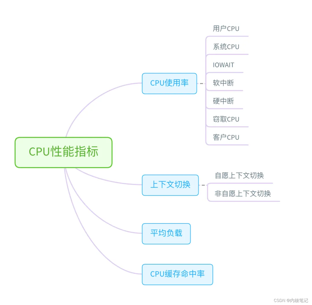 首先,从 CPU 的角度来说,主要的性能指标就是 CPU 的使用率、上下文切换以及 CPU Cache 的命中率等。下面这张图就列出了常见的 CPU 性能指标。
