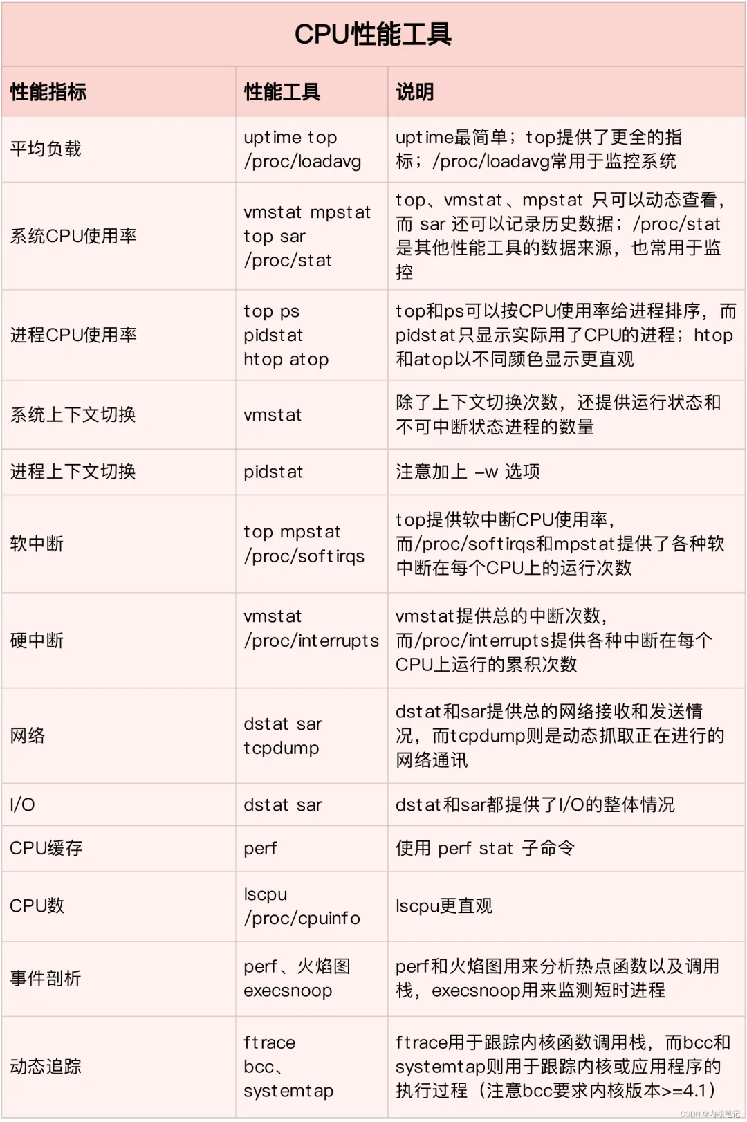 这张图表清晰地列出了针对各Linux子系统的性能分析工具,是极佳的参考资料。但其不足在于粒度较粗:当需要查看某一具体指标时,图表对应的子系统下往往罗列了多个工具,却未指明在何种场景下应如何选择。要做出有效决策,您仍需查阅每个工具的手册并进行对比分析。