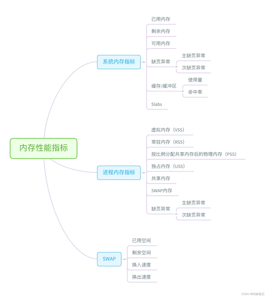 接着我们来看内存方面。从内存的角度来说,主要的性能指标,就是系统内存的分配和使用、进程内存的分配和使用以及 SWAP 的用量。下面这张图列出了常见的内存性能指标。