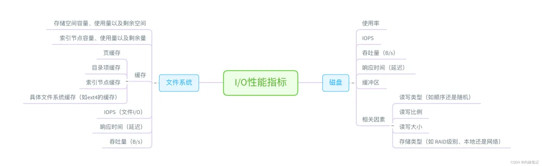 接下来,从文件系统和磁盘 I/O 的角度来说,主要性能指标,就是文件系统的使用、缓存和缓冲区的使用,以及磁盘 I/O 的使用率、吞吐量和延迟等。下面这张图列出了常见的 I/O 性能指标。