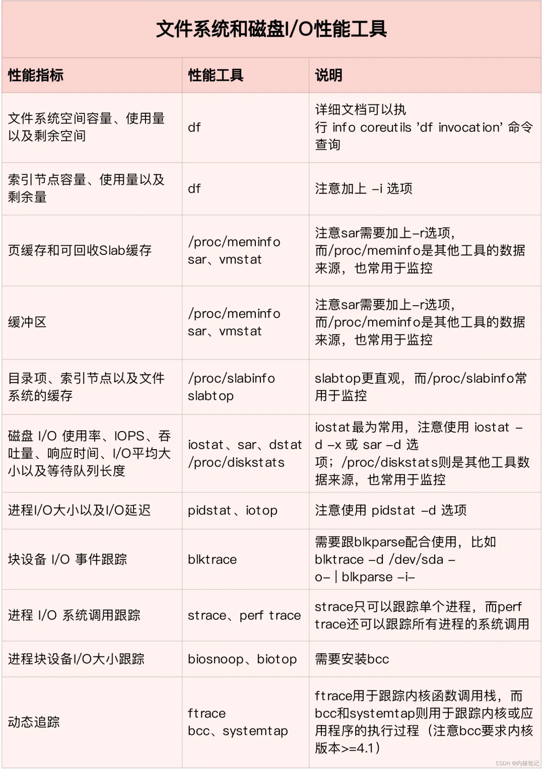 从这些指标出发,我们就可以得到,下面这个文件系统和磁盘 I/O 性能工具速查表。同 CPU 和内存性能工具一样,我也梳理出了这些工具的特点和注意事项。