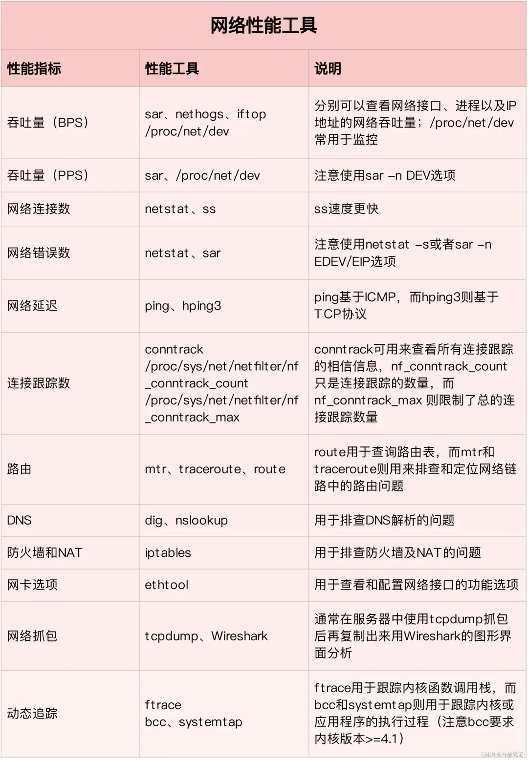 从这些指标出发,我们就可以得到下面的网络性能工具速查表。同样的,我也帮你梳理了各种工具的特点和注意事项。