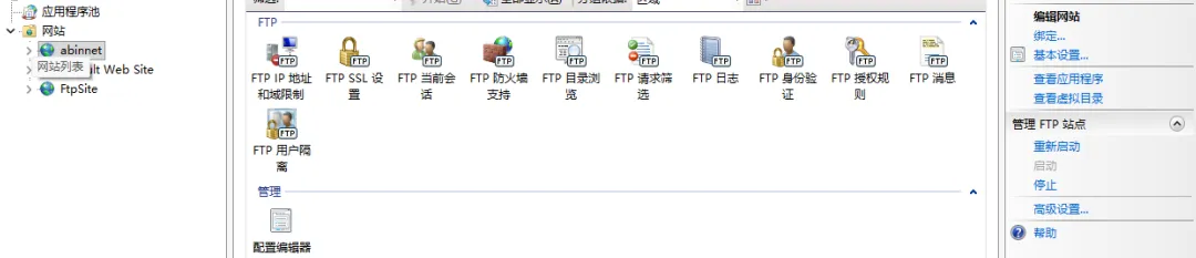 - 5.以上操作完后左侧ftp名称右键重启,或在最右侧-》管理ftp站点-》重新启动