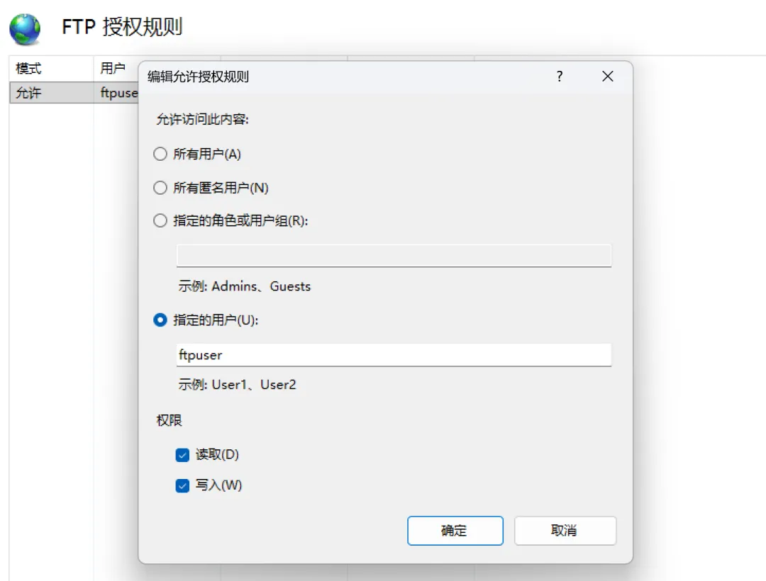 - “FTP 授权规则” → 添加允许规则:选“指定用户”,填刚建的