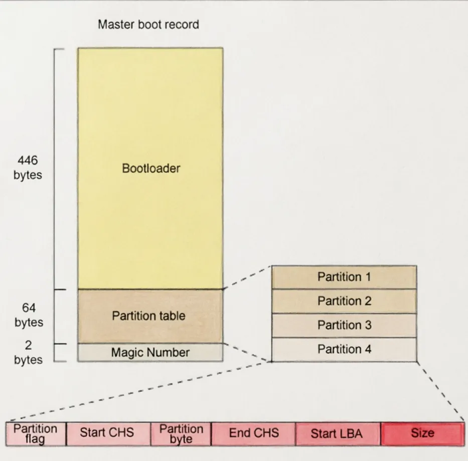 (1)MBR 结构:引导代码 + 分区表 + 0xAA55 签名