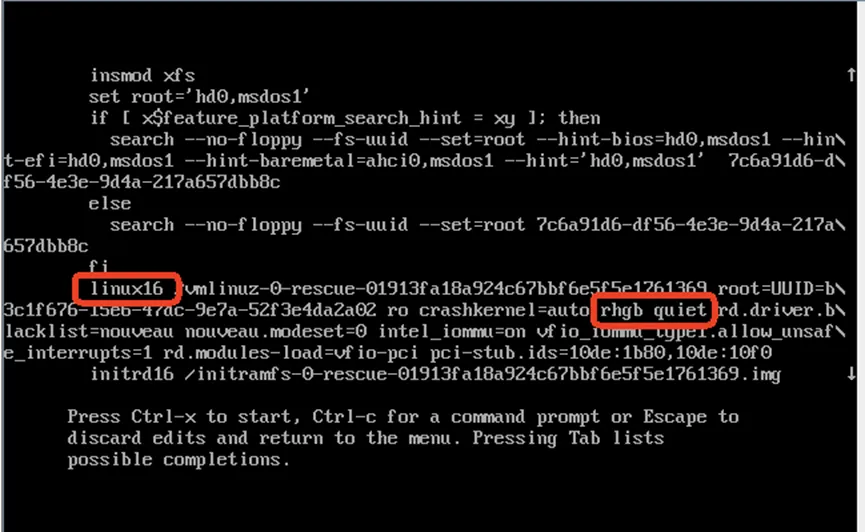 在linux16或linux开头的行,在这一段中找到rhgb quiet并删除,添加以下参数。