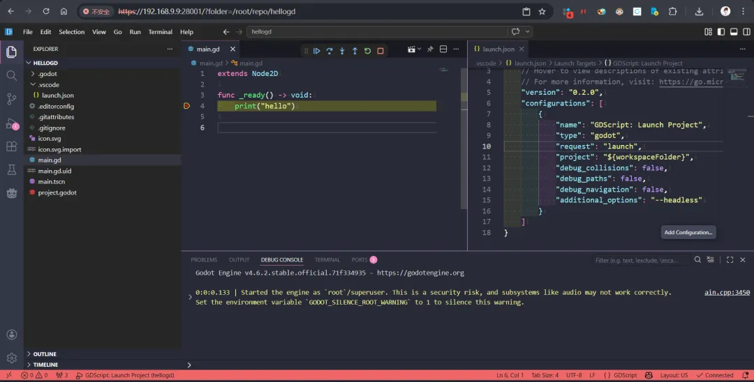 { "name": "GDScript: Launch Project", "type": "godot", "request": "launch", "project": "${workspaceFolder}", "debug_collisions":false, "debug_paths":false, "debug_navigation":false, "additional_options": ""}默认配置直接打断点调试是跑不起来的, 必须在additional_options配置中加上--headless参数