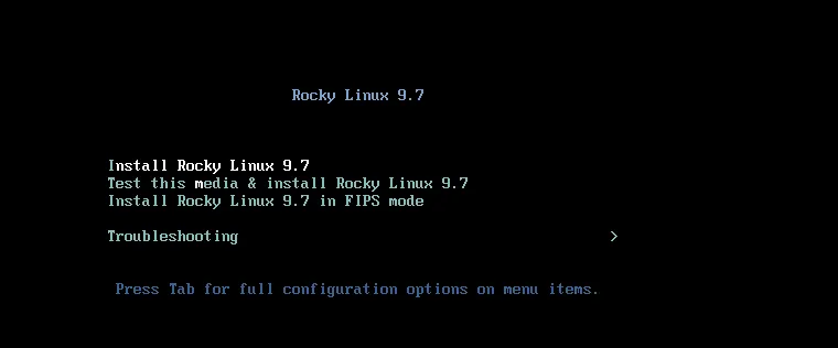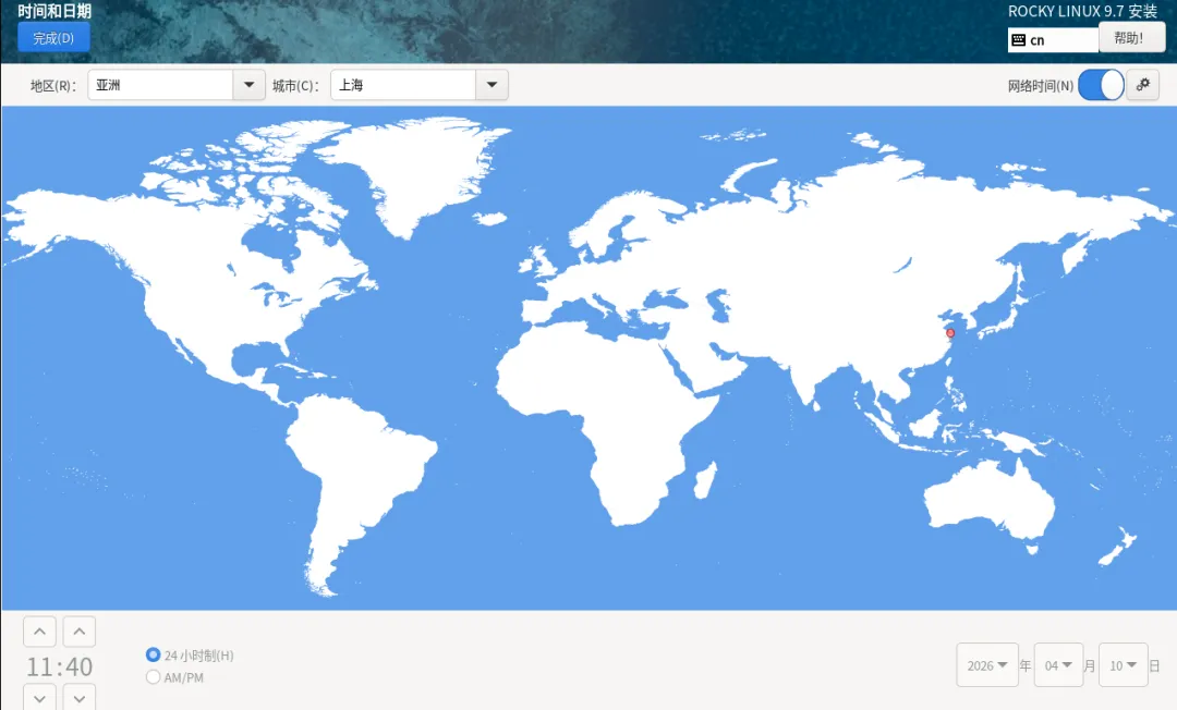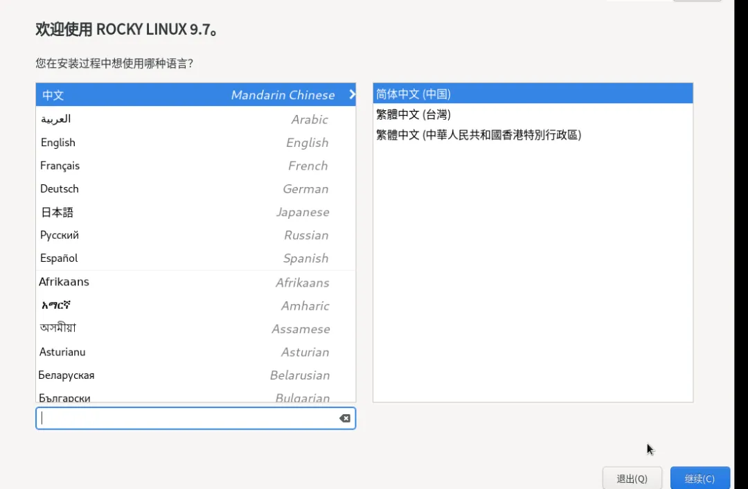 开机以后,显示画面鼠标点进去虚拟机,使用方向键↑,移动到第一行Install Rokcy Linux 9.7,此时会显示白色高亮按回车选「简体中文(中国)」,点击「继续」进入安装摘要页本地化:- 时间与日期:选「亚洲 / 上海」,开启网络时间(NTP),点击「完成」