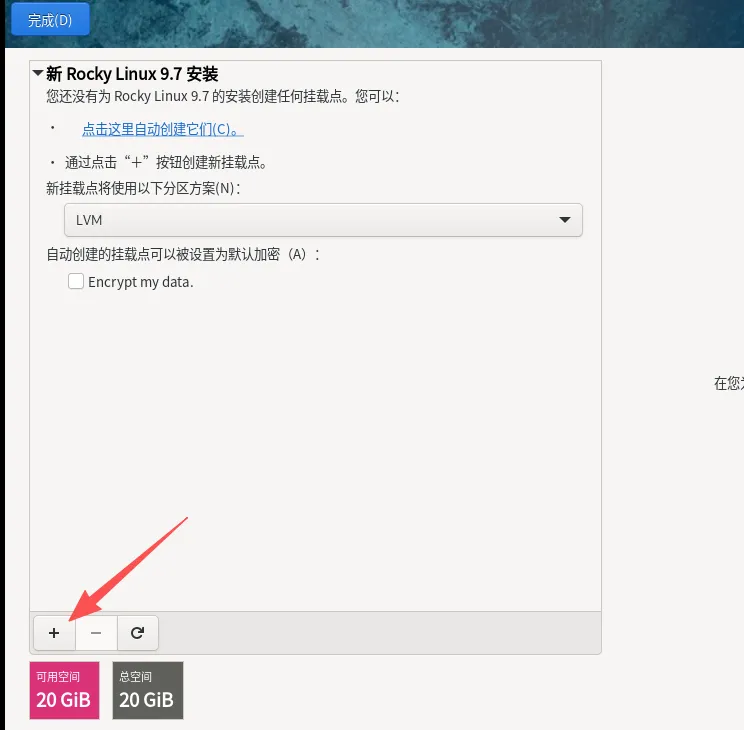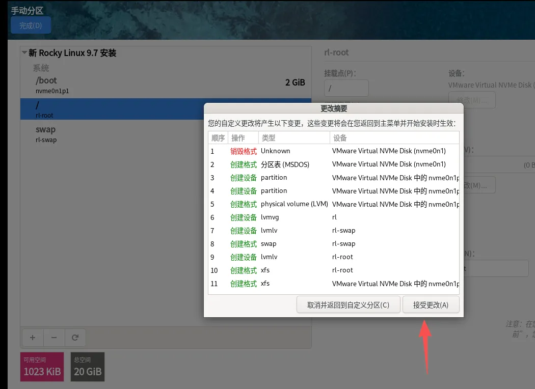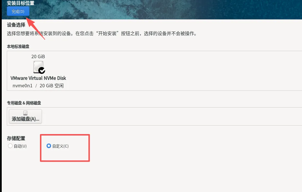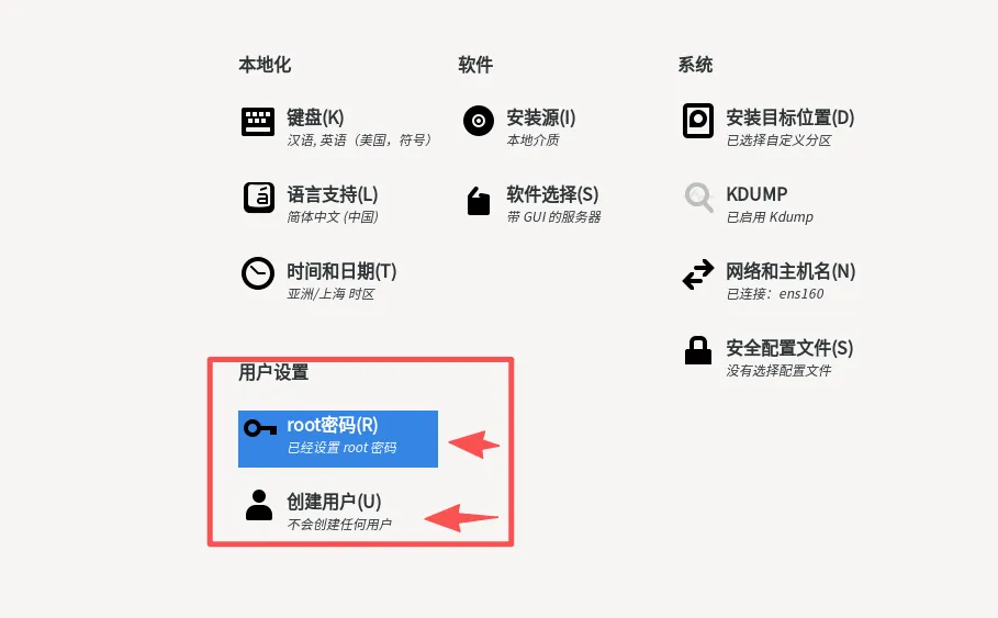 系统配置:- 安装目标:选择目标磁盘,新手选「自动分区」(LVM+XFS);进阶可手动分区(推荐