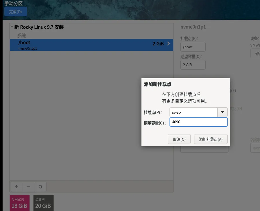 /boot 2GB、swap 8-16GB(内存越大配置越小)、/ 剩余空间),点击「完成」