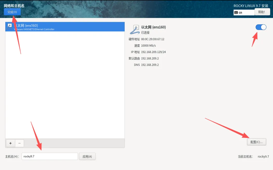 - 网络与主机名:启用网卡(打开蓝色开关),设置主机名(如