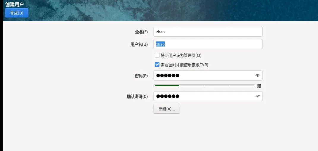 - 创建用户:勾选「将此用户设为管理员」,填写用户名、密码,点击「完成」
