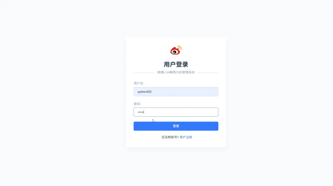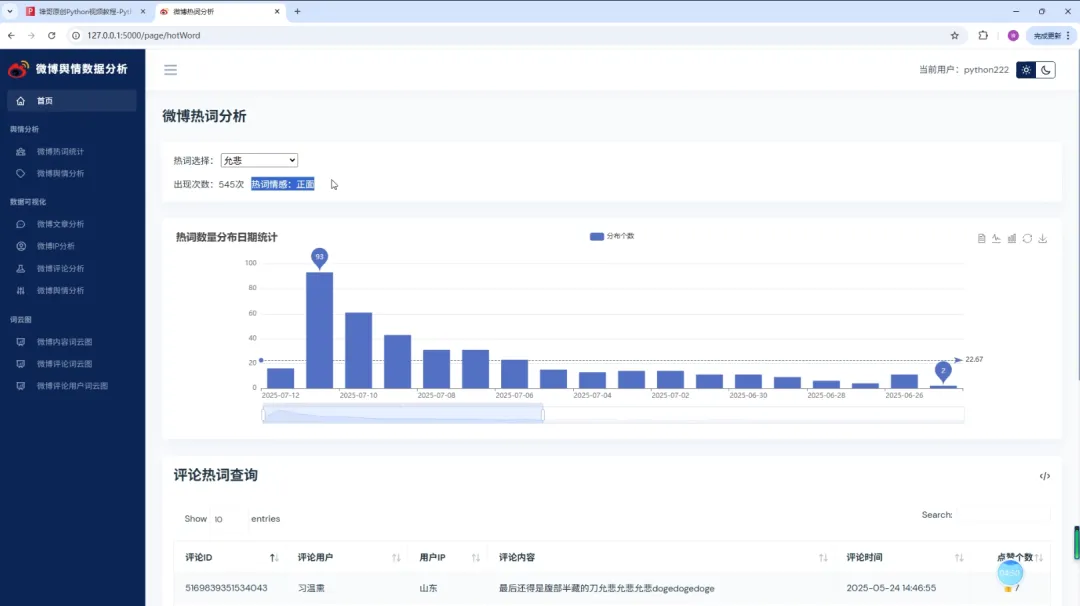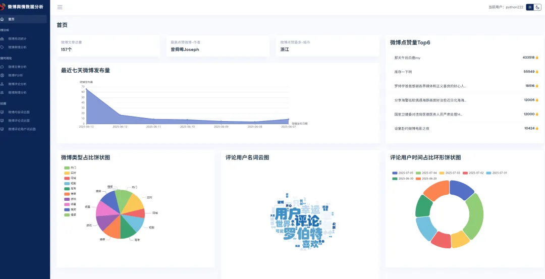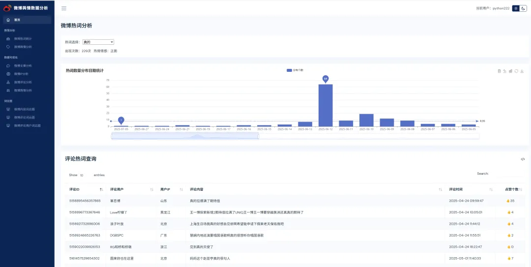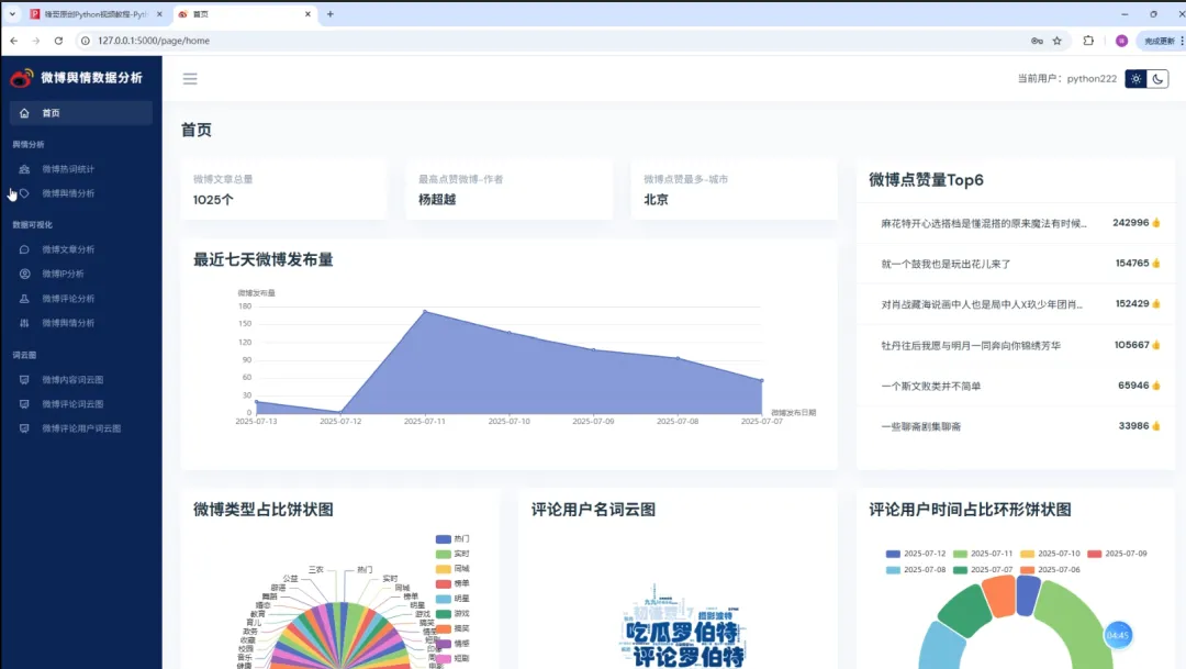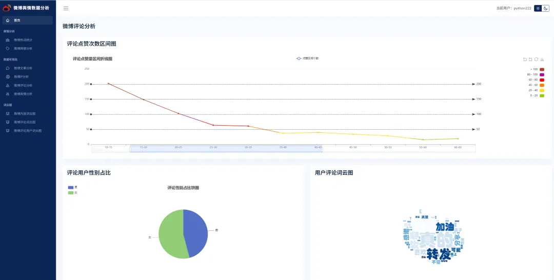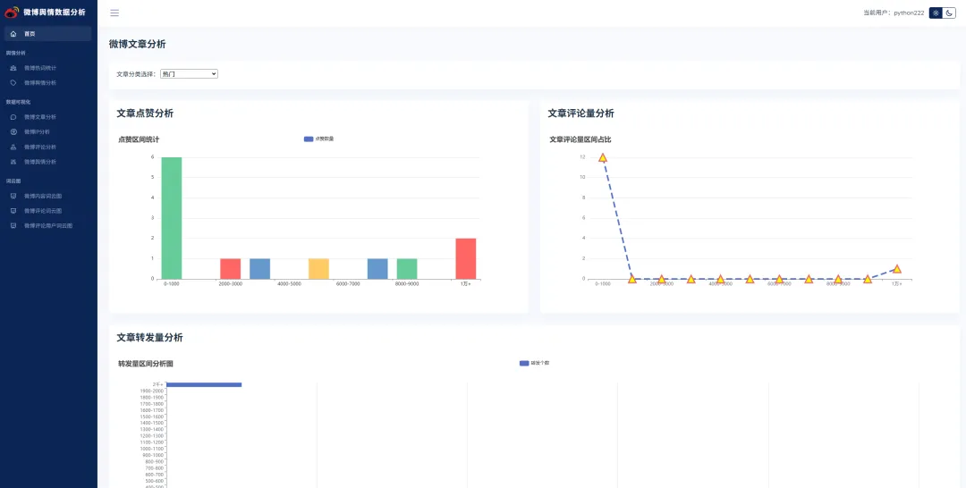 实现了,用户登录,注册,爬取微博帖子和评论信息,进行了热词统计以及舆情分析,以及基于echarts实现了数据可视化,包括微博文章分析,微博IP分析,微博评论分析,微博舆情分析。最后也基于wordcloud库实现了词云图,包括微博内容词云图,微博评论词云图,微博评论用户词云图等功能。
